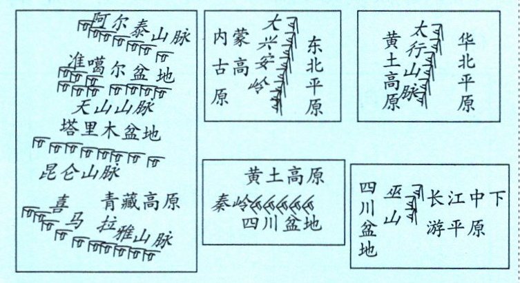 1.骨架 2.如果 A 为太行山脉,则甲、乙分别为黄土高原、华北平原;如果 A 为大兴安岭,则甲、乙分别为内蒙古高原、东北平原;如果 A 为巫山,则甲、乙分别为四川盆地、长江中下游平原。如果 B 是天山山脉,则丙、丁分别是准噶尔盆地、塔里木盆地;如果 B 是昆仑山脉,则丙、丁分别是塔里木盆地、青藏高原;如果 B 是秦岭,则丙、丁分别是黄土高原与四川盆地。 3.福建 江西 新疆维吾尔 西藏