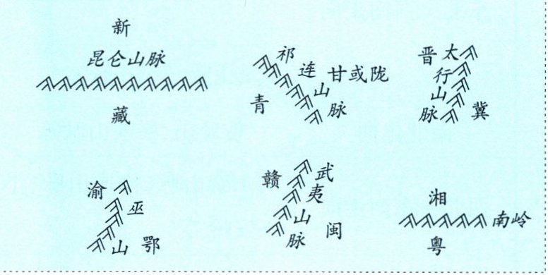 1. 读我国主要山脉分布图,用不同颜色的笔描绘东西、东北—西南、西北—东南、南北不同走向的山脉。观察上图可看出,不同走向的山脉构成了我国地形的“