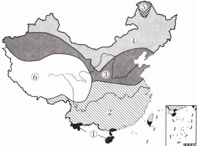 五个温度带。此外,还有一个地高天寒、面积广大的⑥高原气候区
