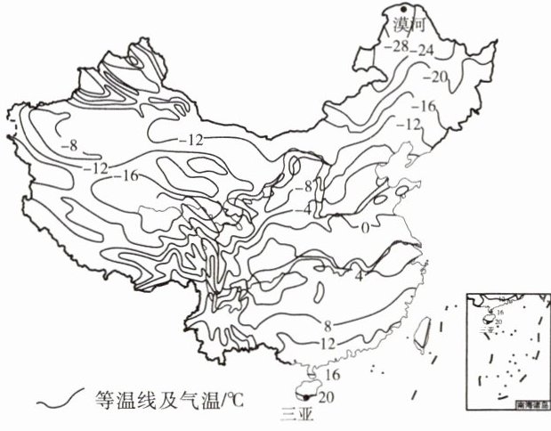 东南边缘。1月黑龙江省漠河市与海南省三亚市的平均气温相差近50℃,南北气温差别很大