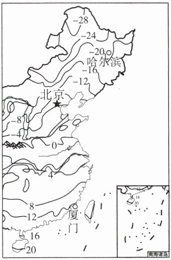 13. 2025年春节,哈尔滨的小明一家去福建厦门度假。度假过程中,爸爸给他布置了一些任务。请你根据所学知识,运用中国1月份东部地区气温分布图(如下图,单位:℃),帮他完成下列任务。