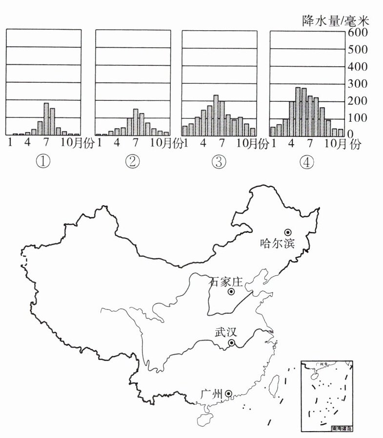 12. 下面为我国广州、武汉、石家庄、哈尔滨四城市的降水量柱状图及其位置示意图。石家庄7月降水量多于哈尔滨。读图,回答下列问题。