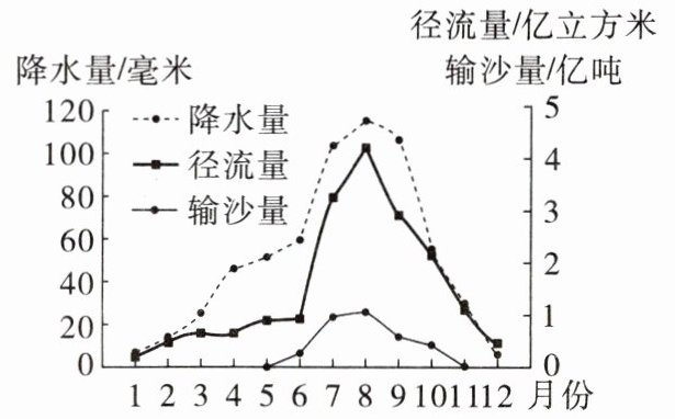 读我国某河流中游某水文观测站的多年月平均降水量、径流量、输沙量变化示意图,完成8~10题。