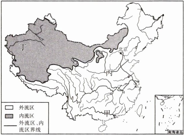 读我国内流区与外流区主要河流分布示意图,完成1~2题。
