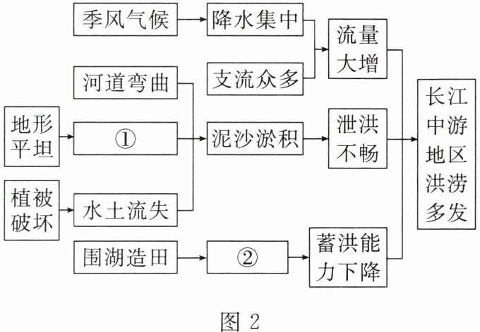 (思维导图)长江流域面积广,流域内自然资源丰富,航运便利,经济发达。读长江流域示意图(图1)和长江中游地区洪涝灾害易发的思维导图(图2),完成8~9题。