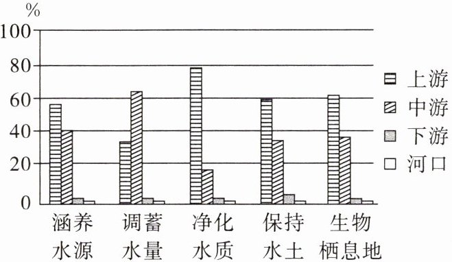 绿色发展,生态优先是长江经济带发展的首要任务。读长江各河段五种生态保护功能所占比重图,完成5~7题。