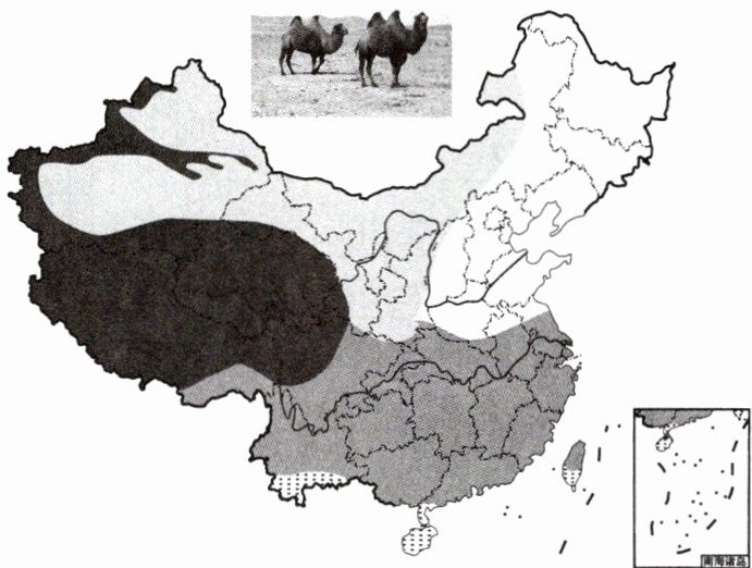 (1)图中所示的是沙漠中的骆驼,该动物主要分布在(