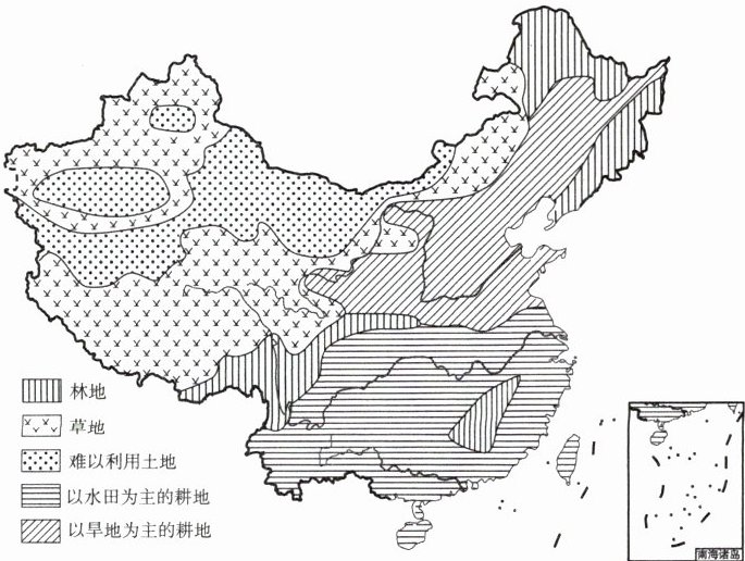 中国土地利用类型多样,拥有耕地、林地、草地等多种土地利用类型,这有利于因地制宜,对土地进行多样化的开发利用。下图为中国主要土地利用类型分布简图。据此完成4~5题。