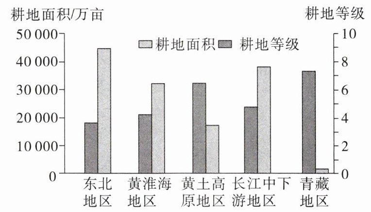 耕地等级数值越小,表示耕地质量越优。读我国部分地区耕地等级和耕地面积示意图,完成6~7题。