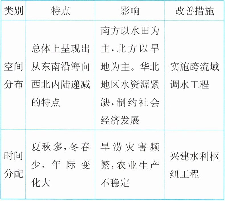 |时间分配|夏秋多,冬春少,年际变化大|旱涝灾害频繁,农业生产不稳定|兴建水利枢纽工程|