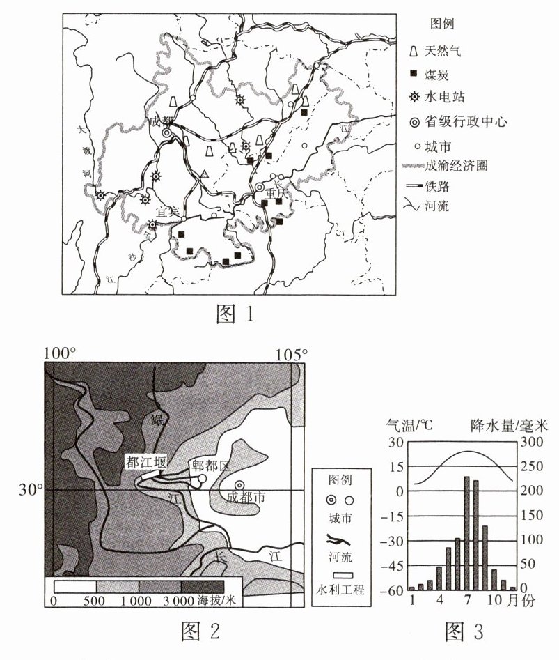 材料三 成渝经济圈示意图(图 1)、成都平原地形图(图 2)和成都的气温曲线和降水量柱状图(图 3)。