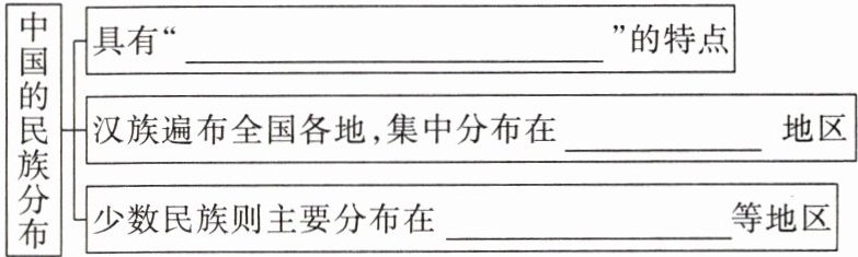 1.大杂居、小聚居、交错居住 东部和中部 东北、西北、西南 2.平等 3.内蒙古 宁夏回族 新疆维吾尔 西藏 广西壮族 4.团结统一 兼收并蓄 相互依存 相互亲近