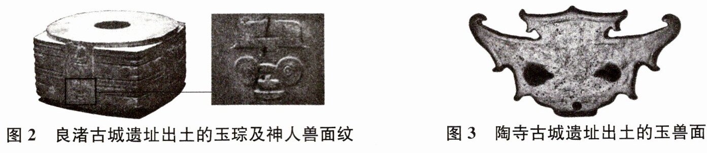 带有神人兽面纹类:图2良渚古城遗址出土的玉琮上的神人兽面纹、图3陶寺古城遗址出土的玉兽面(可看作有兽面元素),这两者纹饰都包含神人兽面等神秘元素,反映了当时人们的宗教信仰和精神文化。