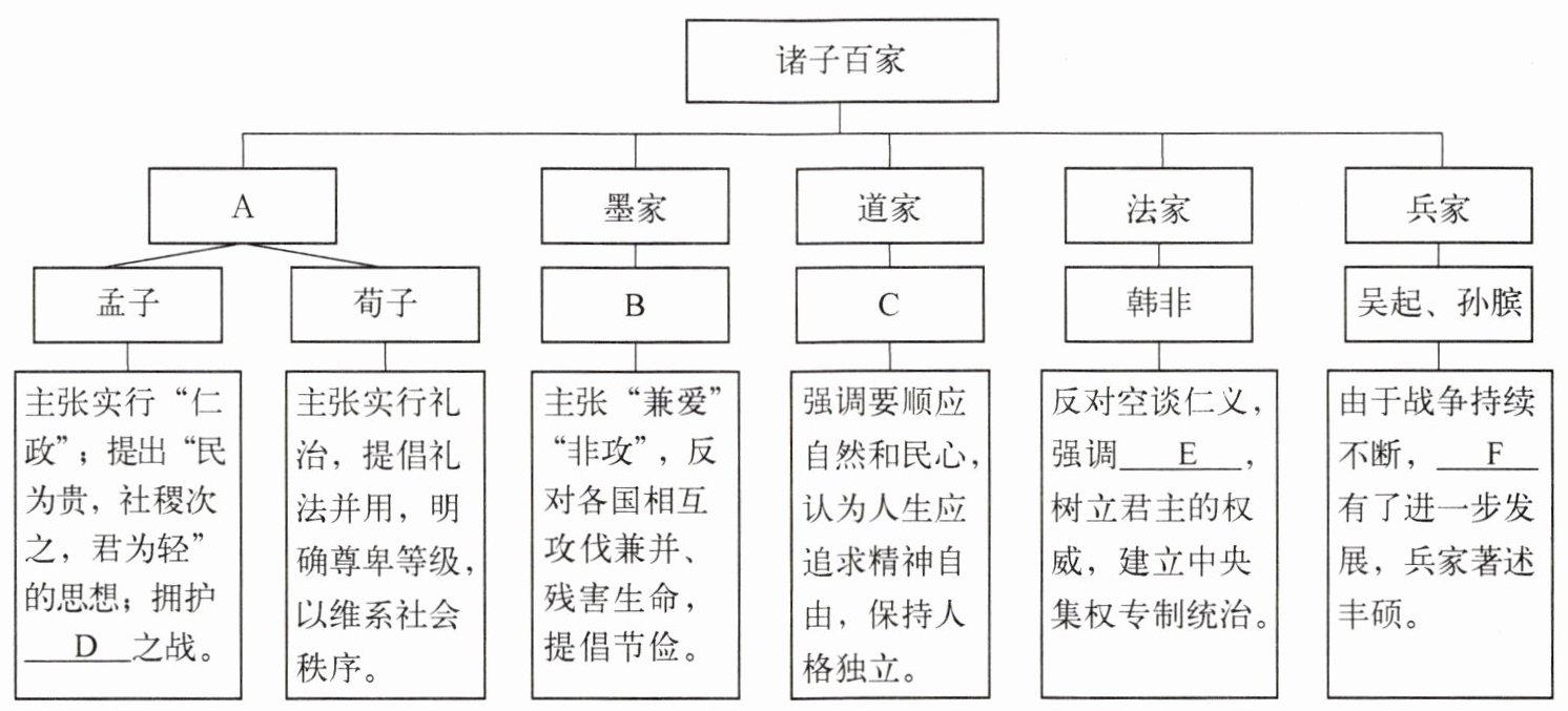 (1)材料一图示的中间两行分别是战国时期的各学派及其代表人物,请将其补充完整。