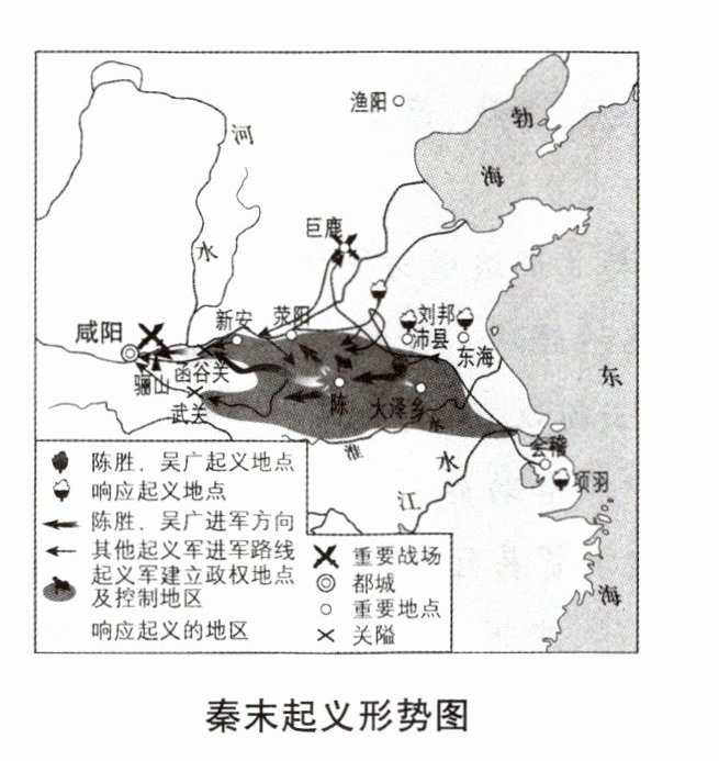 (1)渔阳在图中东北部标注处;陈胜、吴广起义地点为大泽乡(图中东南部标注处)。起义军进攻方向:向西进攻咸阳。