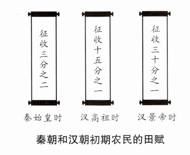(2)措施:让士兵回乡,免除一定赋役;让躲藏民众回原县,恢复其爵位田宅;让自卖为奴婢者恢复平民身份;减轻田租,定为十五税一(或汉高祖实行十五税一;汉景帝定为三十税一)。