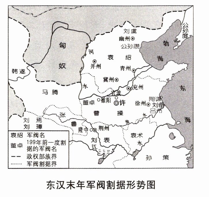 (1)观察材料一中的地图,指出东汉末年的政治局势。