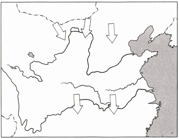 情形一:草原上的民族向南移动,箭头指向中原地区等(图上方向基本向下指向中原方向);原因:全球气候变冷,草原地区更为寒冷,为了寻求更适宜的生存环境,草原上的民族慢慢向南移动。