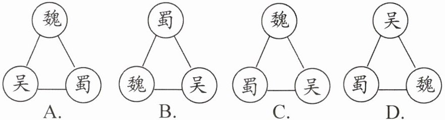 2. 下图是三国鼎立形势示意图,其中符合地理方位、正确显示鼎立关系的是(
