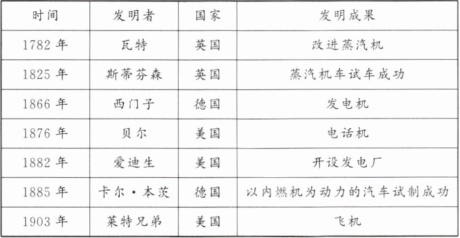 时间发明者国家发明成果1782 年瓦特英国改进蒸汽机1825 年斯蒂芬森英国蒸汽机车试车成功1866 年西门子德国发电机1876 年贝尔美国电话机1882 年爱迪生美国开设发电厂1885 年卡尔·本茨德国以内燃机为动力的汽车试制成功1903 年莱特兄弟美国飞机