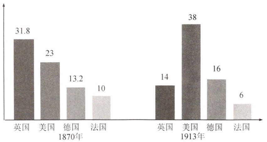 美国、德国的占比上升,英国、法国的占比呈下降趋势。美国、德国在第二次工业革命中走在世界前列;美国内战北方胜利,扫清了资本主义发展的障碍;英法依赖于广大的殖民地,技术和设备更新缓慢。