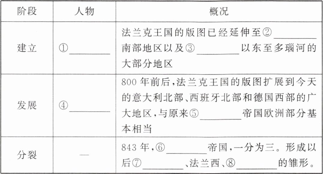 7. 结合所学知识,完成有关“法兰克王国发展历程”的简表。