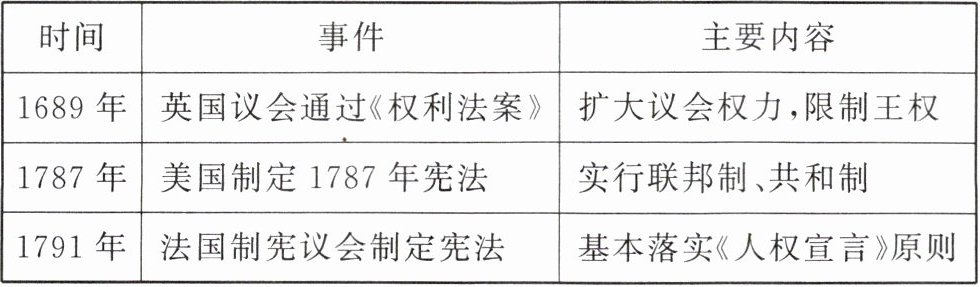 |1689 年|英国议会通过《权利法案》|扩大议会权力,限制王权|
