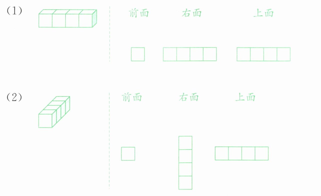 用4个同样大的正方体摆一摆,使它从前面、右面和上面看到的图形都相同。