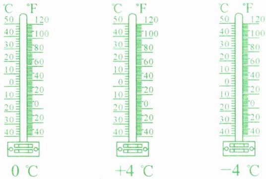 综上,按照上述方法在温度计上分别对$0^{\circ}C$、$ + 4^{\circ}C$、$-4^{\circ}C$进行涂色即可(实际为操作题,按上述思路用彩笔等工具在对应温度计上涂色)。