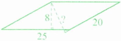 3. 下图是一个平行四边形,相邻两边的长分别是25厘米和20厘米,一条高是8厘米,图中未知的高是多少厘米?