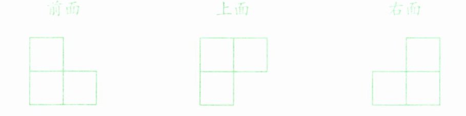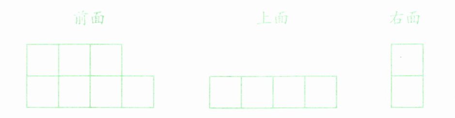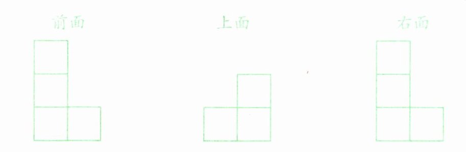 1. 小明用棱长1分米的正方体摆成三个物体,下面分别是从不同方向观察这三个物体所看到的图形,你知道这三个物体的体积各是多少立方分米吗?