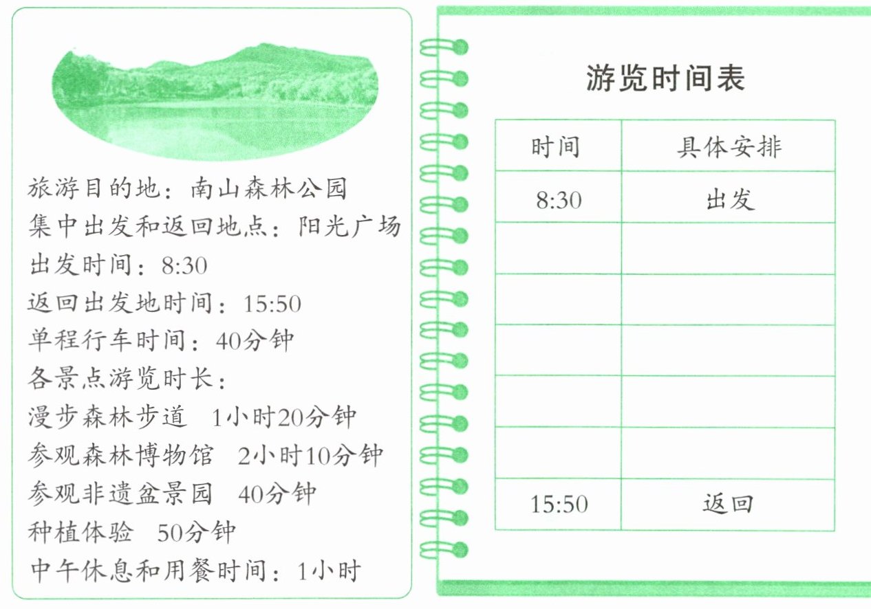 文文一家参加旅行社组织的南山森林公园一日游,以下是相关信息。根据下面的信息,帮助文文一家规划游览时间表。