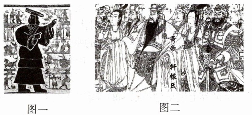 (1)图一。因为黄帝是一个部落联盟的首领,不具有特权,不脱离劳动,图一服饰与氏族没有太大区别,头上戴的帽子可能是首领的标志;而图二把黄帝描绘成一个帝王,身边有随从、宫妃、文武大臣,这是阶级和国家产生以后才出现的历史现象。(2)缅怀先祖,纪念黄帝。(3)继承先祖伟业,努力学习,为中华民族的伟大复兴而奋斗。
