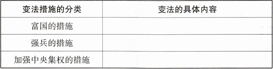 2. 分类归纳有助于理解和记忆历史知识。根据下面分类,填写并记住商鞅变法的相关措施。