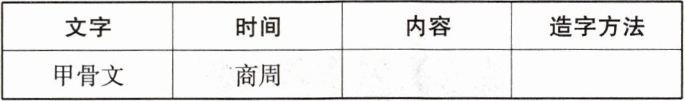 1. 文字的出现是人类进人文明社会的重要标志。你能根据下列表格,记住我国甲骨文的相关史实吗?