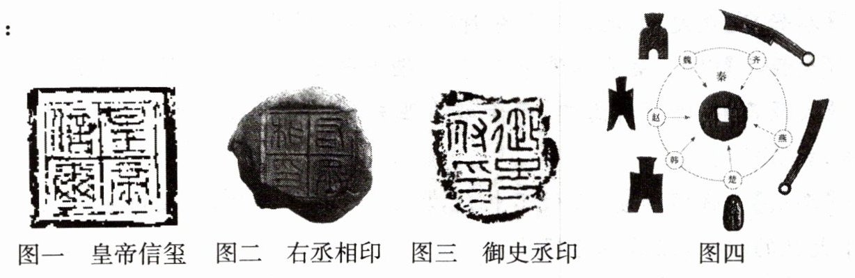 本题选用实物资料和文献资料展示了秦统一中国后,建立中央集权制度和巩固统一的相关措施。解答时注意完整、准确地从图片和文字材料中提取有效信息,同时快速地找到图文材料与课本的关联,进行知识的迁移与运用。