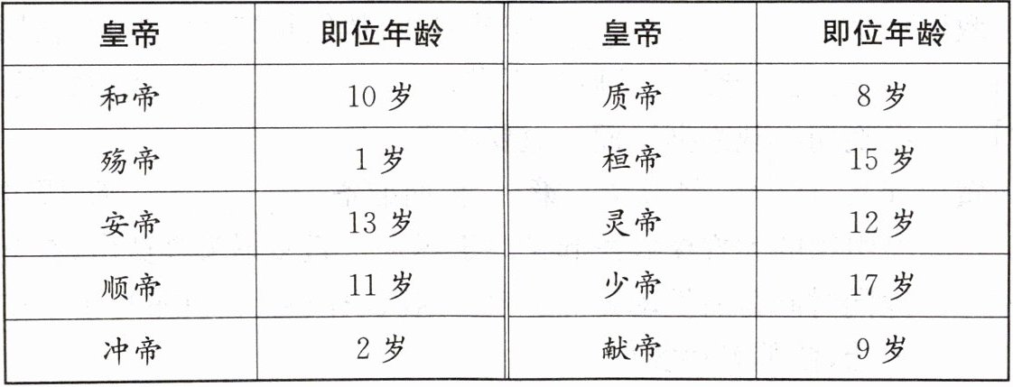 本题综合选用了文字材料、图表材料。读图表材料时,要看表头及出处,确定其反映的历史事件、现象及时期;要看表格项目,根据设问发现表格数据信息的时间、空间、数量变化;看表格数据纵横变化,分析表格有效信息所反映的现象,并与课本知识建立联系。本题两则材料分别从政治腐朽、社会混乱和继位皇帝年幼(外戚、宦官专权)反映了东汉动荡的原因。