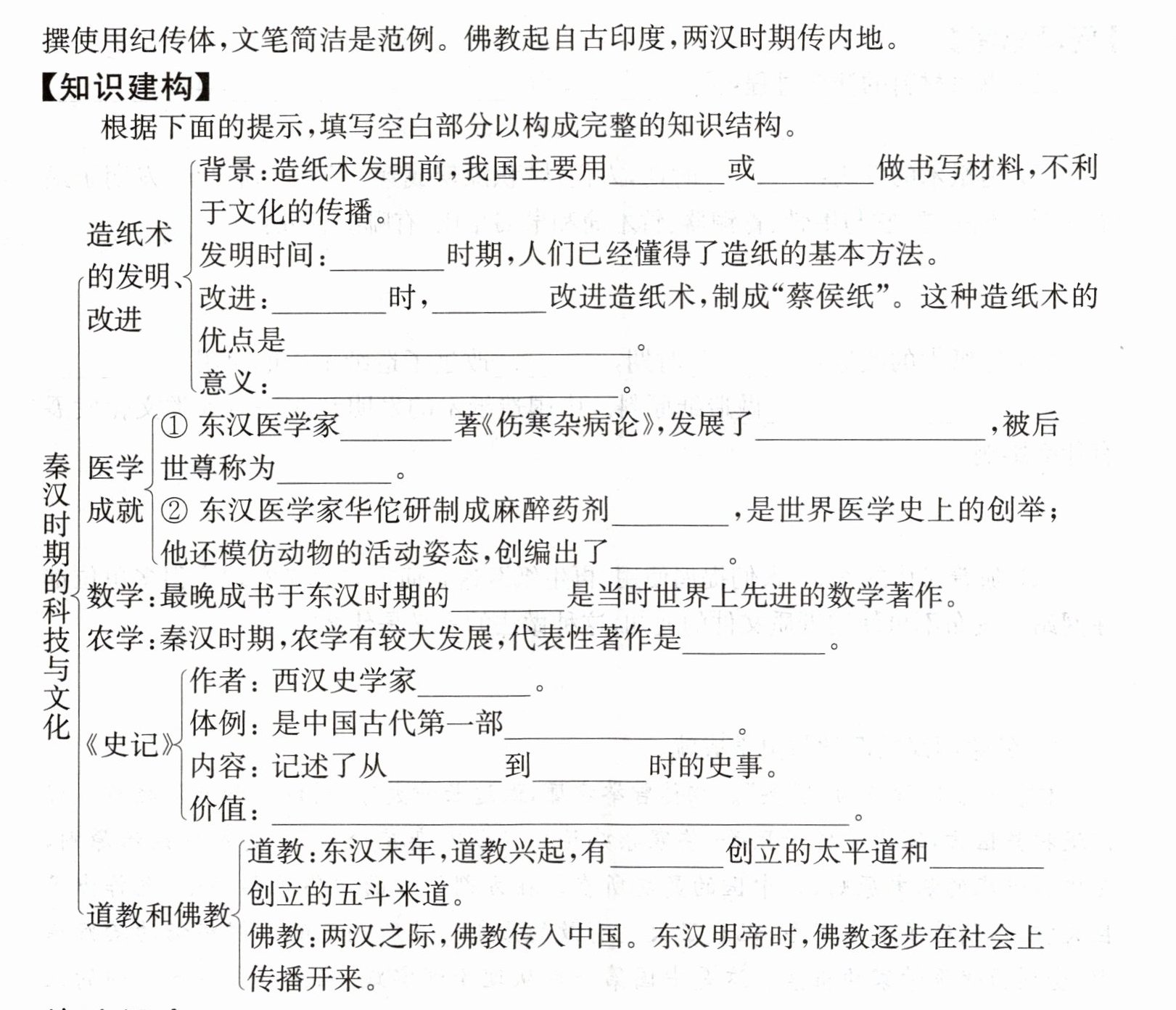 竹简;帛;西汉;东汉;蔡伦;纸的质量大大提高,原料易找,价格便宜,易于推广;促进了文化的传播与发展;张仲景;中医学的理论和治疗方法;医圣;麻沸散;五禽戏;《九章算术》;《氾胜之书》;司马迁;纪传体通史;黄帝;汉武帝;是中国古代第一部纪传体通史,对中国史学发展产生了深远影响,文笔优美,所记人物形象生动,在文学史上也有崇高地位;张角;张陵