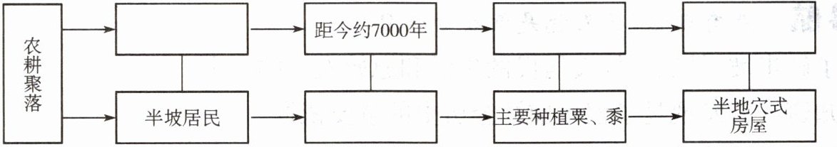 本课以河姆渡居民、半坡居民为代表,展示了距今六七千年以前我国原始农耕文明的状况。请根据下面知识结构,填写相关史实。