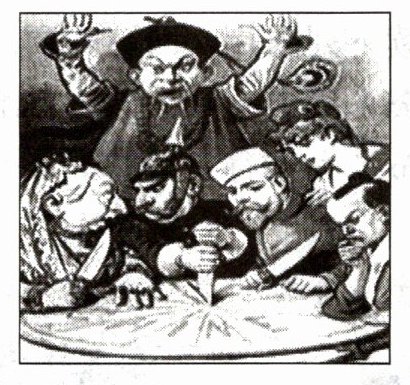 左边漫画中的“大饼”代表着当时任人宰割的中国,而围着大饼的是手中握有匕首的列强,他们迫不及待地对着“大饼”下手,唯恐落于人后,“大饼”的主人则只有振臂疾呼,望饼兴叹。漫画展现了“大清”不堪一击、任人宰割的景象。