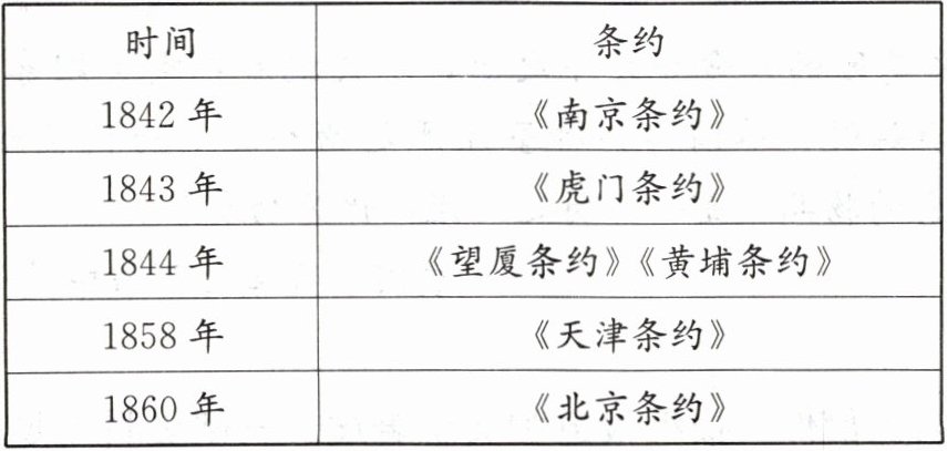 (1)背景:第一次鸦片战争,中国/清政府战败;第二次鸦片战争,中国/清政府战败(或者两次鸦片战争,清政府/中国战败)。 (2)目的:进一步打开中国市场,扩大侵略权益(要强调是第二次鸦片战争的影响,是进一步、扩大);内容(示例):《天津条约》增开汉口、南京等十处为通商口岸。 (3)影响:使中国半殖民地半封建化程度逐步加深。