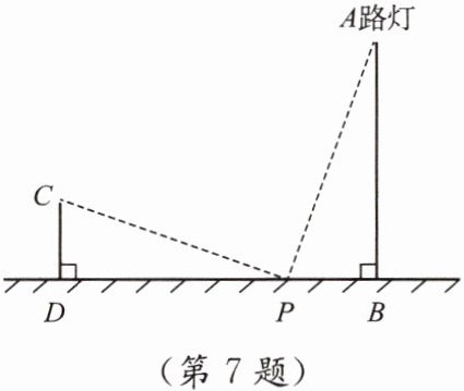 7. 小明利用一根 $ 3 m $ 长的竹竿按如下方式测量路灯的高度:如图,在路灯前选一点 $ P $,使 $ BP = 3 m $,并测得 $ \angle APB = 70^{\circ} $,然后把竖直的竹竿 $ CD (CD = 3 m) $ 在 $ BP $ 的延长线上移动,使 $ \angle DPC = 20^{\circ} $,此时量得 $ BD = 11.2 m $. 根据这些数据,请计算出路灯的高度.