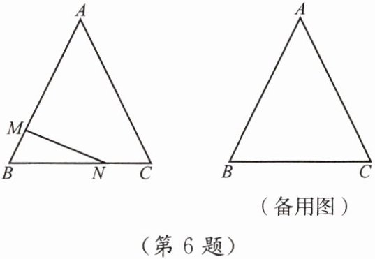 6. 如图,在等边三角形 $ABC$ 中,$AC = 12\mathrm{cm}$,点 $M$ 以 $2\mathrm{cm/s}$ 的速度从点 $B$ 出发向点 $A$ 运动(不与点 $A$ 重合),点 $N$ 以 $3\mathrm{cm/s}$ 的速度从点 $C$ 出发向点 $B$ 运动(不与点 $B$ 重合),设点 $M$,$N$ 同时运动,运动时间为 $t\mathrm{s}$.