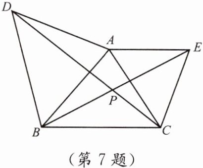 7. 如图,在 $\triangle ABC$ 中,分别以 $AB$,$AC$ 为边向外作等边三角形 $ABD$、等边三角形 $ACE$,$CD$ 与 $BE$ 相交于点 $P$.