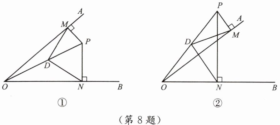 8. (1)如图①,$ P $ 是 $ \angle AOB $ 的内部任意一点,$ PM \perp OA $,$ PN \perp OB $,垂足分别是 $ M $,$ N $,$ D $ 是 $ OP $ 的中点. 求证:$ \angle MDN = 2 \angle MON $.