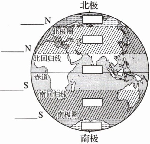 3. 人们根据各地获得太阳光热的多少,把地球表面划分为五个带,读教科书第25页,在下图中方框内填写五带名称并标注界线纬度。