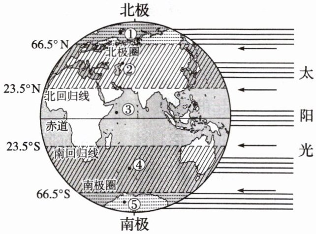 3.B 4.A 解析 第3题,①地位于北寒带,终年严寒,四季不分明;②地位于北温带,④地位于南温带,两地季节相反;③地位于南北回归线之间,地处热带,有太阳直射现象;南北半球分界线是赤道,⑤地位于南极圈以南。第4题,图示时刻,太阳直射赤道,全球各地昼夜等长;②地获得太阳光热比③地少;柳州正处于春季或秋季;因为此时②地不是夏季,当地的学生不会放暑假。