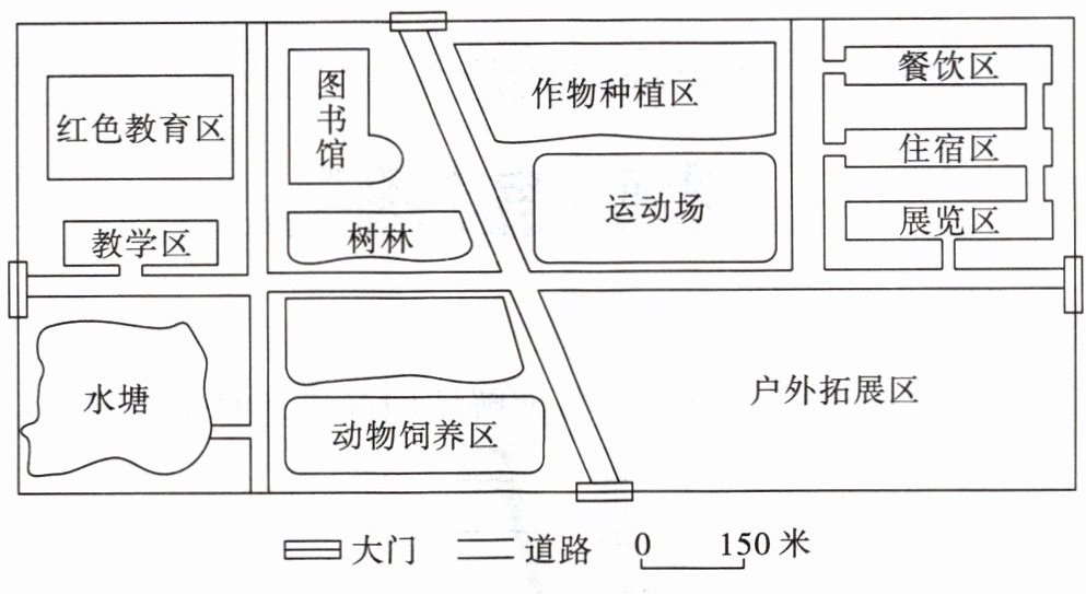 7. 某日,烟台某中学组织学生前往附近综合实践基地开展主题活动。读实践基地平面图,下列关于该基地说法正确的是( )