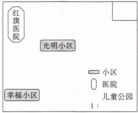 (2)题,根据幸福小区距离红旗医院正好2千米,在图上的距离为2厘米,可以得出图示比例尺为图上1厘米表示实地距离1千米;儿童公园位于光明小区东北方向2千米处,根据指向标可以得出其图中位置大致应位于光明小区正下方2厘米处。儿童公园的图例可自行设置。第