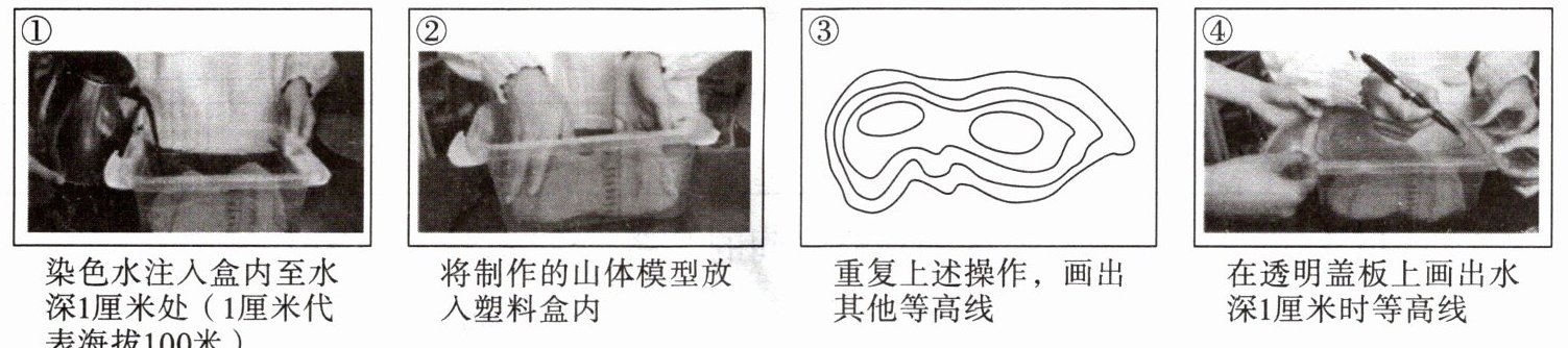 (1)题,绘制等高线地形图时首先将制作的山体模型放入塑料盒内,再将染色水注入盒内至水深1厘米处,然后在透明盖板上画出水深1厘米时等高线的形状,最后重复上述操作,画出其他等高线,所以绘制等高线地形图过程的正确排序是②①④③。第